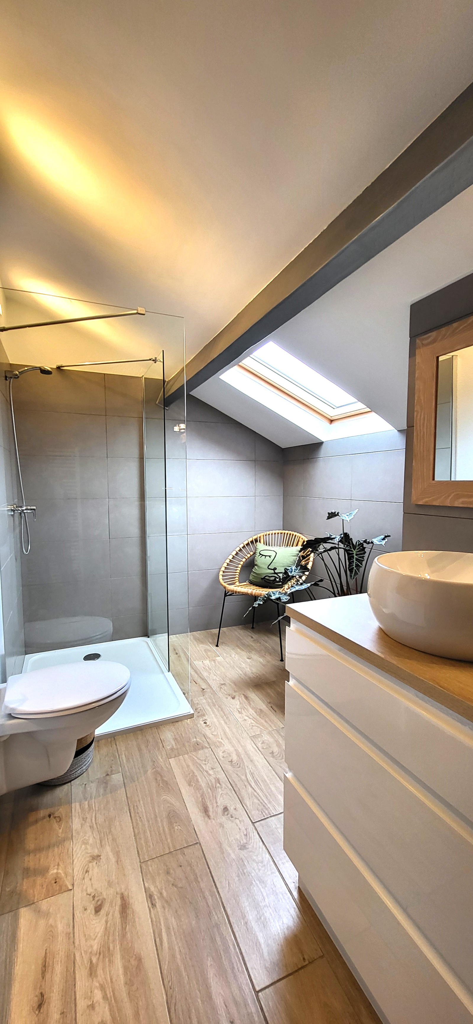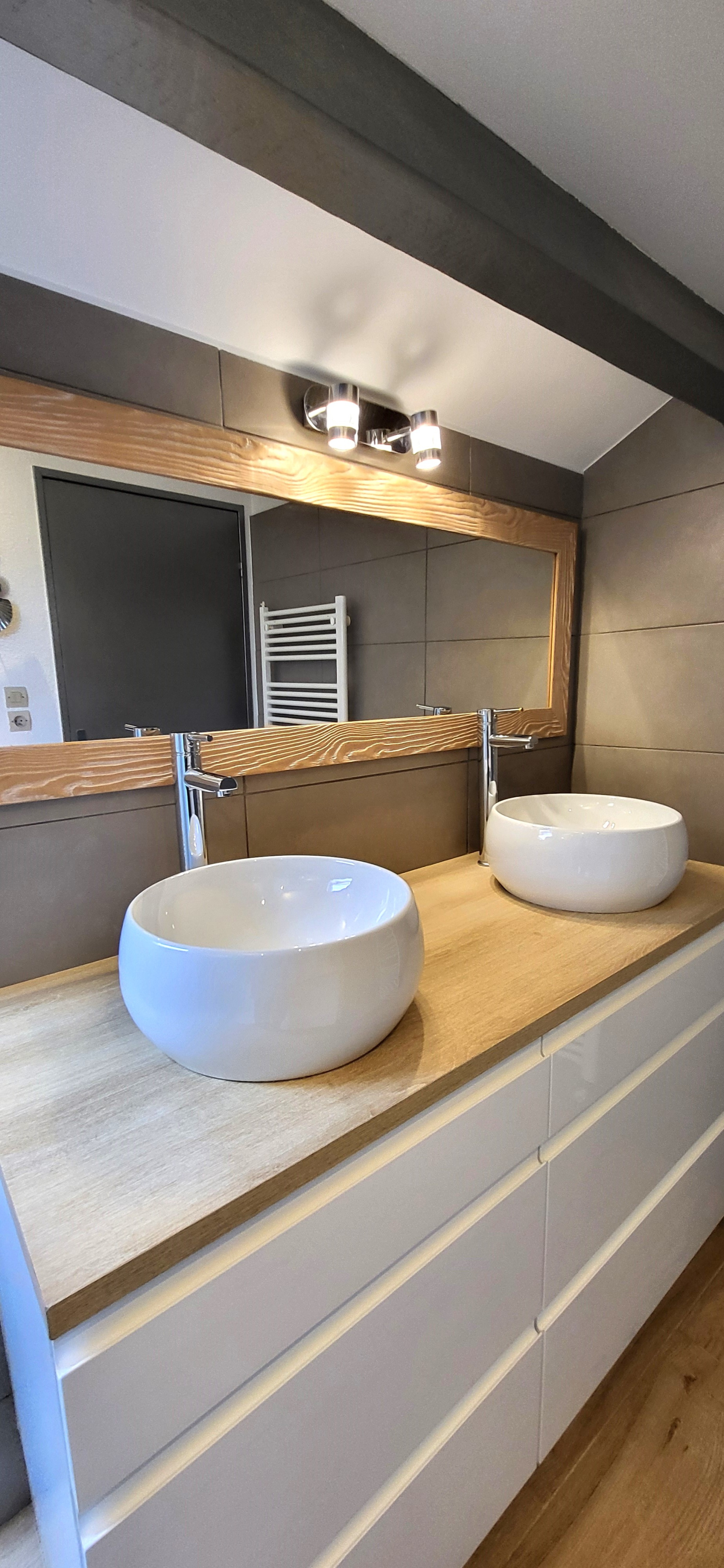 L'étage comprend un palier desservant trois chambres équipées de placard et une salle d'eau chaleureuse et moderne deux vasques.